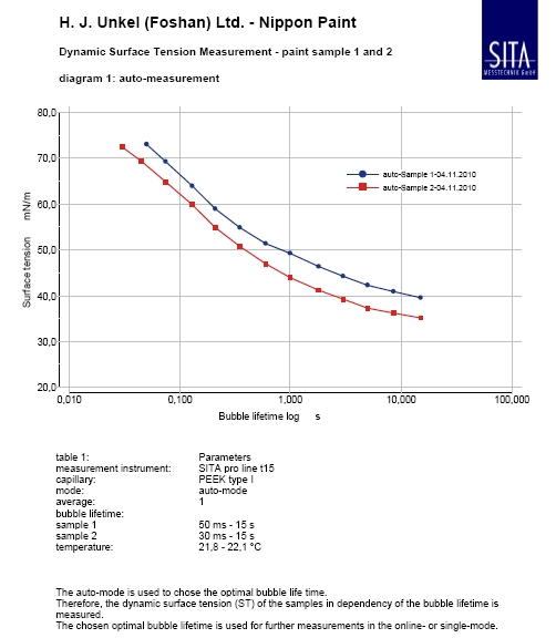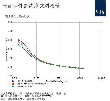 不同批次的助劑里面的表面活性劑濃度是否一樣?相關(guān)多少?實(shí)際濃度是多少?用SITA動(dòng)態(tài)表面張力儀,可以快速測(cè)定來(lái)料的質(zhì)量。