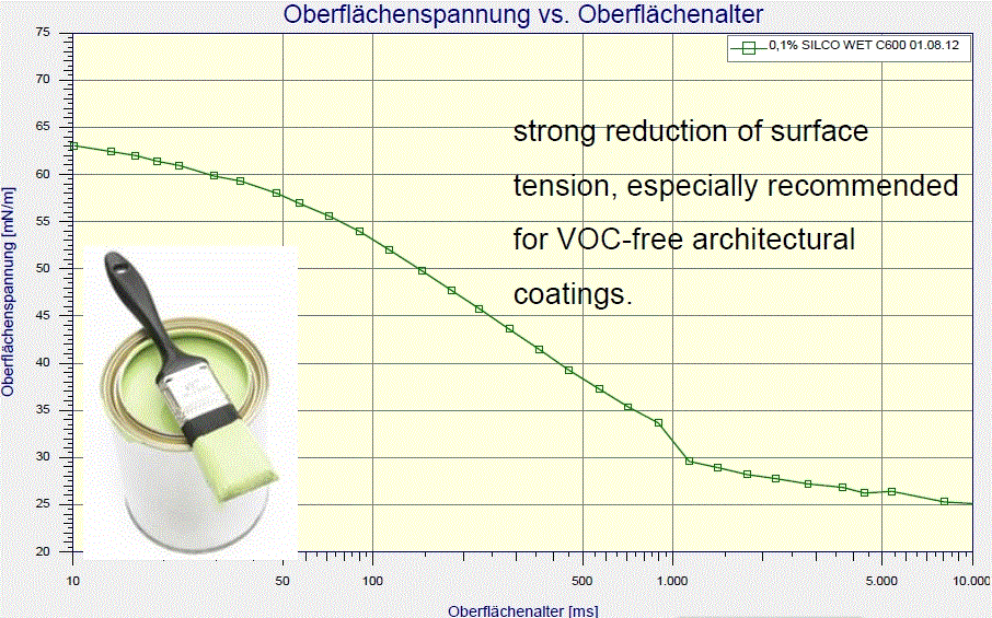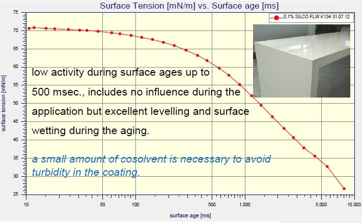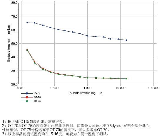 上圖為某品牌0.1%潤(rùn)濕劑水溶液,表面張力在短氣泡壽命下已很低,而且下降很快。在實(shí)際應(yīng)用中,對(duì)于木材等多孔性底材,要求快速潤(rùn)濕性能的,實(shí)際的應(yīng)用中流平和潤(rùn)濕效果都很好。
