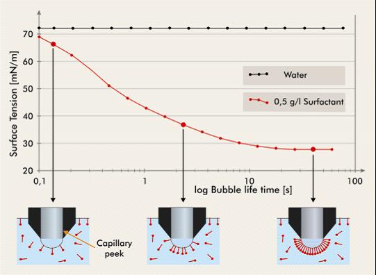 如下圖所示,圖1是SITA 泡壓法表面張力儀的毛細管剛形成新的氣泡(即新的界面)時,表面活性劑只有少量聚集到新的界面上。隨界面形成的時間越久(即氣泡壽命越長),表面活劑劑聚集到界面上就越多,因此表面張力也隨著時間而不斷的變化,通過電腦能夠繪制出完整的動態(tài)表面張力變化曲線。